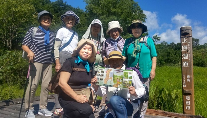 朝6時出発、玉原湿原センターハウスに9時着。旅組と登山口で別れ、緑色の木々の中へ。澄んだ空気、静寂な森の中は歩きやすく葉っぱの絨毯は脚に優しくて、嬉しい。時々小鳥のさえずりに耳を澄ませ、深呼吸。バス酔い気味の身体がシャキっとする。熊よけの鈴、笛を吹きながらブナの森を進む。早速、沼田の名木100選のブナの巨木「ミズメ」に出会う。樹齢400年位立つのか、長い年月、このブナ林の番人であったのだろうか?別名「ヨグソミネバリ」とか。そこに群がる虫や植物、自然の生き物の不思議を見てきたのだろう。歴史の重みを感じさせる古巨木だ。湿原特有の目に向かってくるハエやアブとの苦戦を繰り返している内に、目の前がパーっと開け、カンカン照りの太陽とスキー場のゲレンデいっぱいの花畑。中でも赤紫色の綺麗な群衆は「ミツバヒヨドリ」という花で毒の含んだ密らしい。この密を好んで毒を貯め込み、鳥の攻撃を防いでいるという蝶。「アサギマダラ」は国境を越えて大海原を移動するという毒々しくも美しい蝶で人気アニメの「鬼滅の刃」のキャラクターのモデルというから驚きだ。皆さん知っていましたか?10月頃には会えるかも。