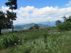 ゲレンデの暑さはこれでもか、と照りつけ、汗がしたたり落ちる。木陰で小休止、水を飲んで振り返ると絶景!遠くの山々は青空に映え、白い雲は笑っている。涼しい風に元気をもらい、樹林帯に入ったり出たり、やっと1636.7mの鹿俣山に11時登頂。遠くの玉原湖、赤城山、浅間山を望み、記念写真を撮り、即、下山。平らな木陰で昼食。美味しいおにぎりときゅうりの漬け物は最高!リーダーの誕生祝いのハッピバースディーの合唱。これなら熊の親子も来ないだろう。手綱を締め直して転ばぬようにマイナスイオンを胸一杯に吸い込みながら足早に一歩一歩着実に!と声を掛けながら下山。足底筋膜炎の我が左足も何とかごまかしながらセンターハウスに到着。そして元気な旅組と合流。ご褒美のラベンダーソフトの美味しかった事。さらに川場田園プラザの道の駅でホワイトコーンをゲット。ヤッター!あとはいつものバスでの楽しいひととき!昔は高い山を制覇したお姉様方、元気!元気!まだまだ行ける!