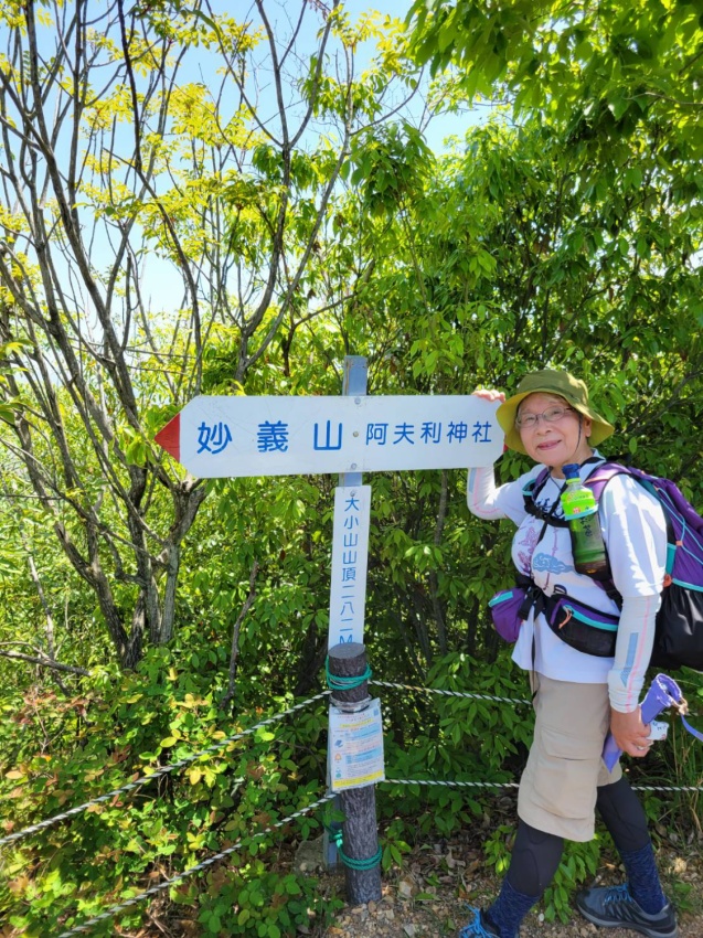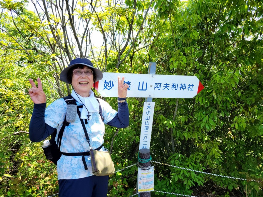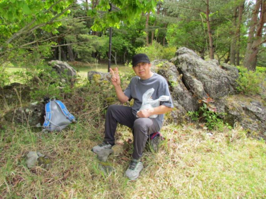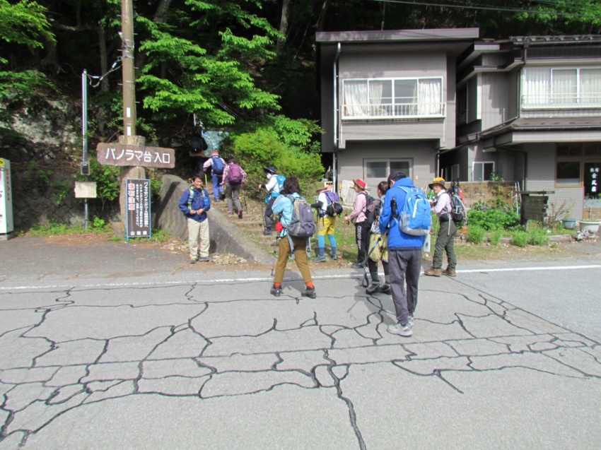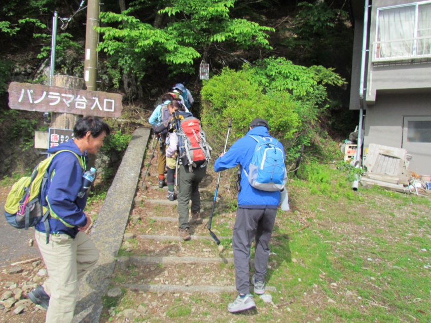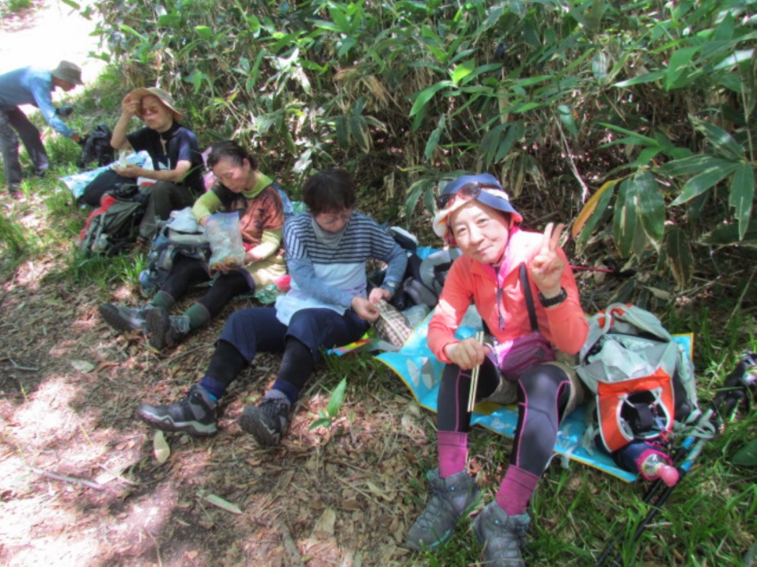 大小山入口からすぐ急登「見晴コース・女坂」の看板、女坂なのにキツイ!!無言で登る。途中Nさんが体調不良で下山する。Nさんを心配しながら見晴台まで登る。水休憩を取りながら新緑の景色を眺めていると会長が「昔ここでラーメンを作って食べたな~」と思い出話をする。もう一息!
