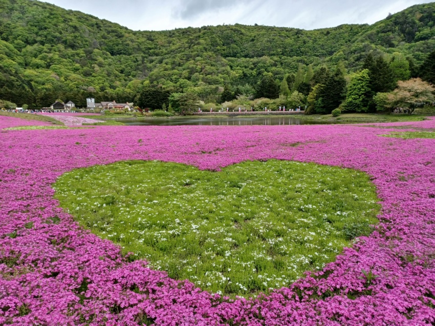 前日の気温とは違い、曇りで、肌寒く、風が強く、芝桜はGWがピークで、タイミングがどうかなぁ~と不安がよぎる。当日の朝で、バスに乗り込みいざ、出発でしたが、道も順調で、早目に現地につき、時間があり、運転手さんの有難い心遣いで、旅組だけの、秘密のお札の風景の所に立ち寄り、皆様感動して、そのつぎ、芝桜を見に行ったのですが、ここは、外国と思う程、海外の方が、多く、ピークを過ぎたとはいえ、芝桜も僕らを待っていたように、華麗に咲き誇っていました。