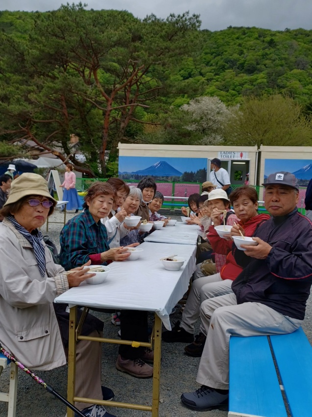 残念なのは、混雑で、富士山や芝桜のフォトスポットは長蛇の列で、映え写真が取れなかった事と寒さの為、食事が楽しめなかった事です。山組を待っている時間、皆様とお茶をしました。