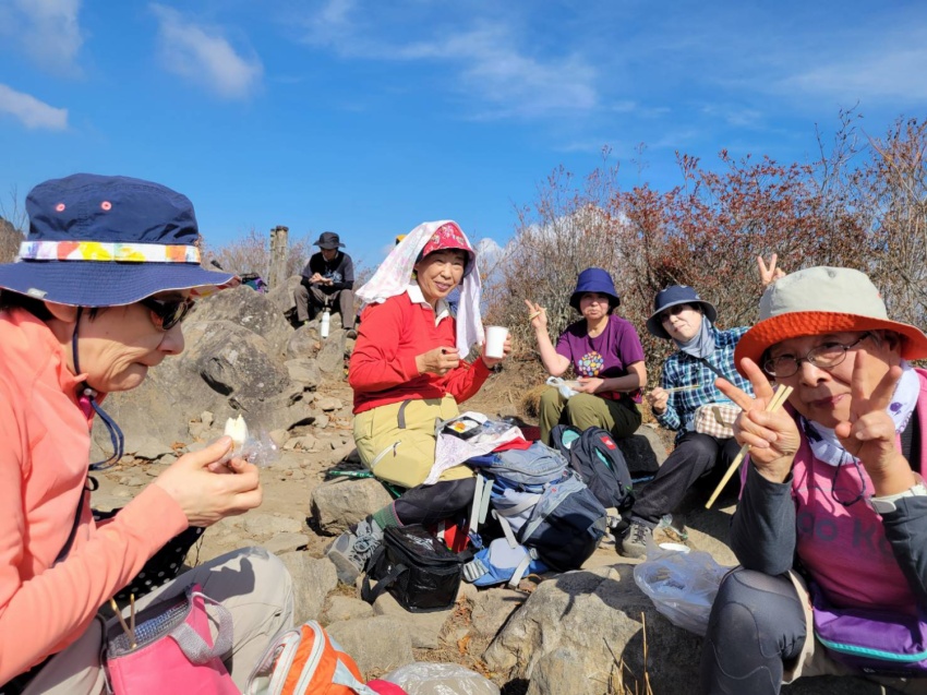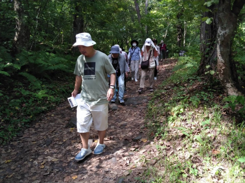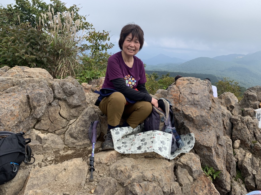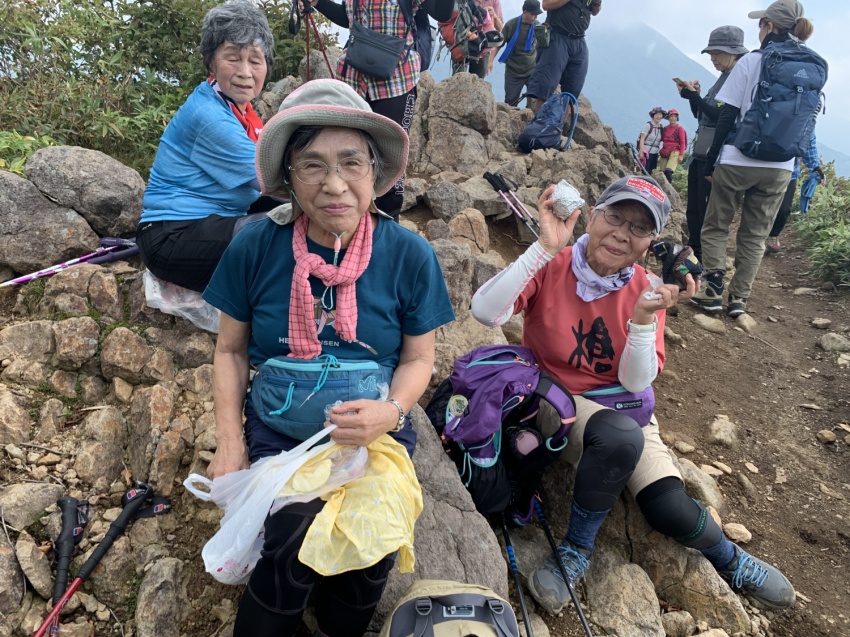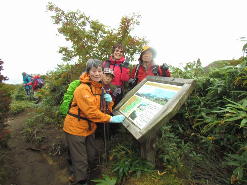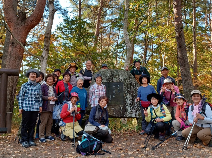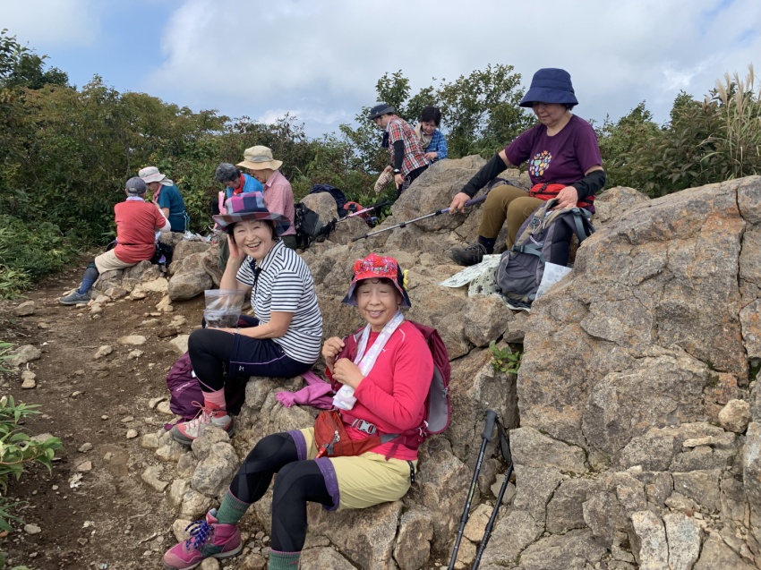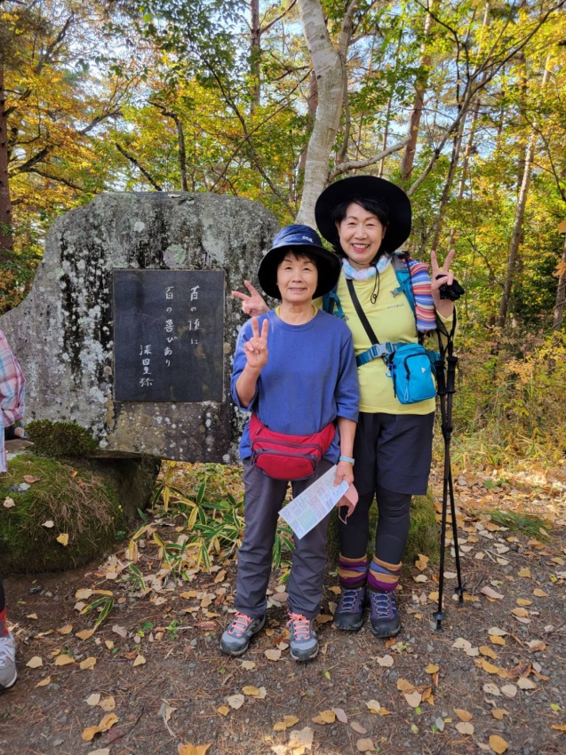 深田記念公園で、旅組と皆で記念撮影後登山スタート。風もなく穏やかな登山日和、歩き出すと暑いくらいで半袖になってちょうどよい。上りは岩場も随所にあり踏みあと分からない所ではMさんが前に来てくださり助けられ、へこたれそうになるとKさんのグットタイミングでの励ましの声で頂上まで登りきることができました。