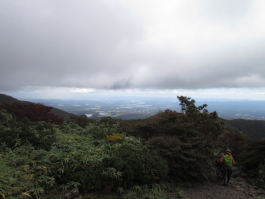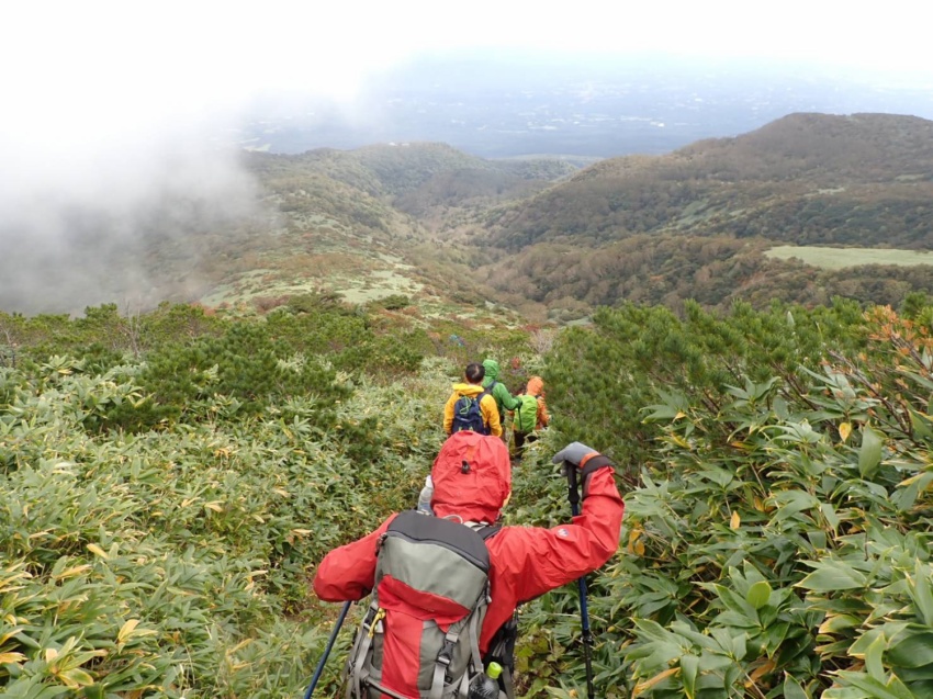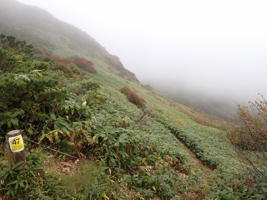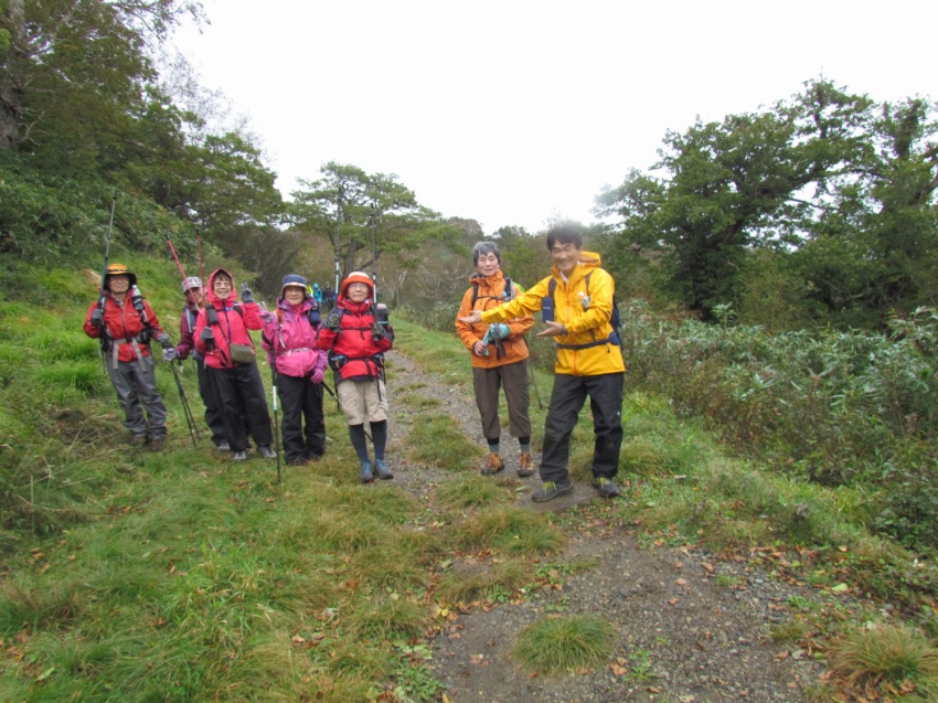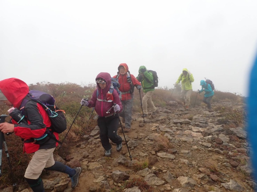 だが進むにつれ、道は霧に覆われホワイトアウト。が、雨は降らずにいた。ビュー! 突然雨まじりの強風が。「雨具を着て」。急ぎ雨具を着装した。でも、このぐらいの風雨なら心配はない。しかし、メンバーを見ると雨具下のない方、数名‥。ヤバっ。風1m強くなるごとに体感温度は1度下がる。さらに、雨に濡れると体感温度は急激に下がって、低体温症の危険が‥(×_×)。後方にいた市川さんに「低体温症の危険があるので下ります!」。