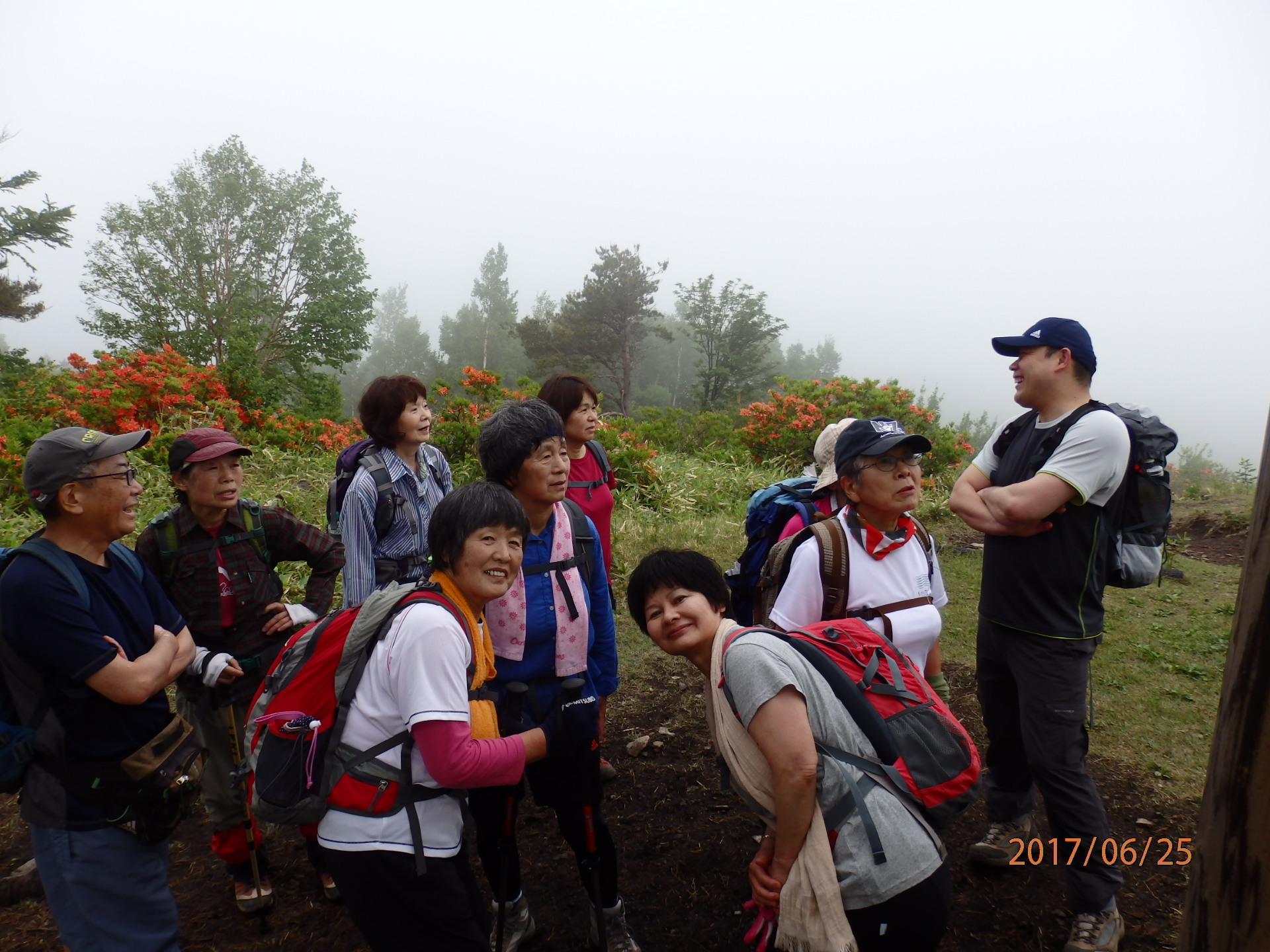 6月の山行の根子岳に参加しました。生憎春日部では雨で長野観光に変わるかと思いましたが長野に入ったらみんなの思いが通じ雨が上がり山に登りました。濃霧で周りが見えずらかったがそれが幻想的でツツジや鉱山植物が鮮やかに咲いていました。山頂では冬に戻ったかのように温度が下がっていました。帰りのバスでは恒例の清水さんコーナーで車内は盛り上がりました。